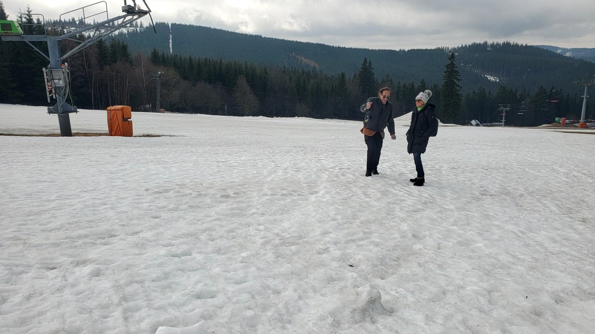 05.04.26 11.33 Mal scheint sie und mal nicht. An den oberen Schluesselbauden in Benecko starten heute sehr viele Touristen zur Elbequelle bei typischem Aprilwetter.