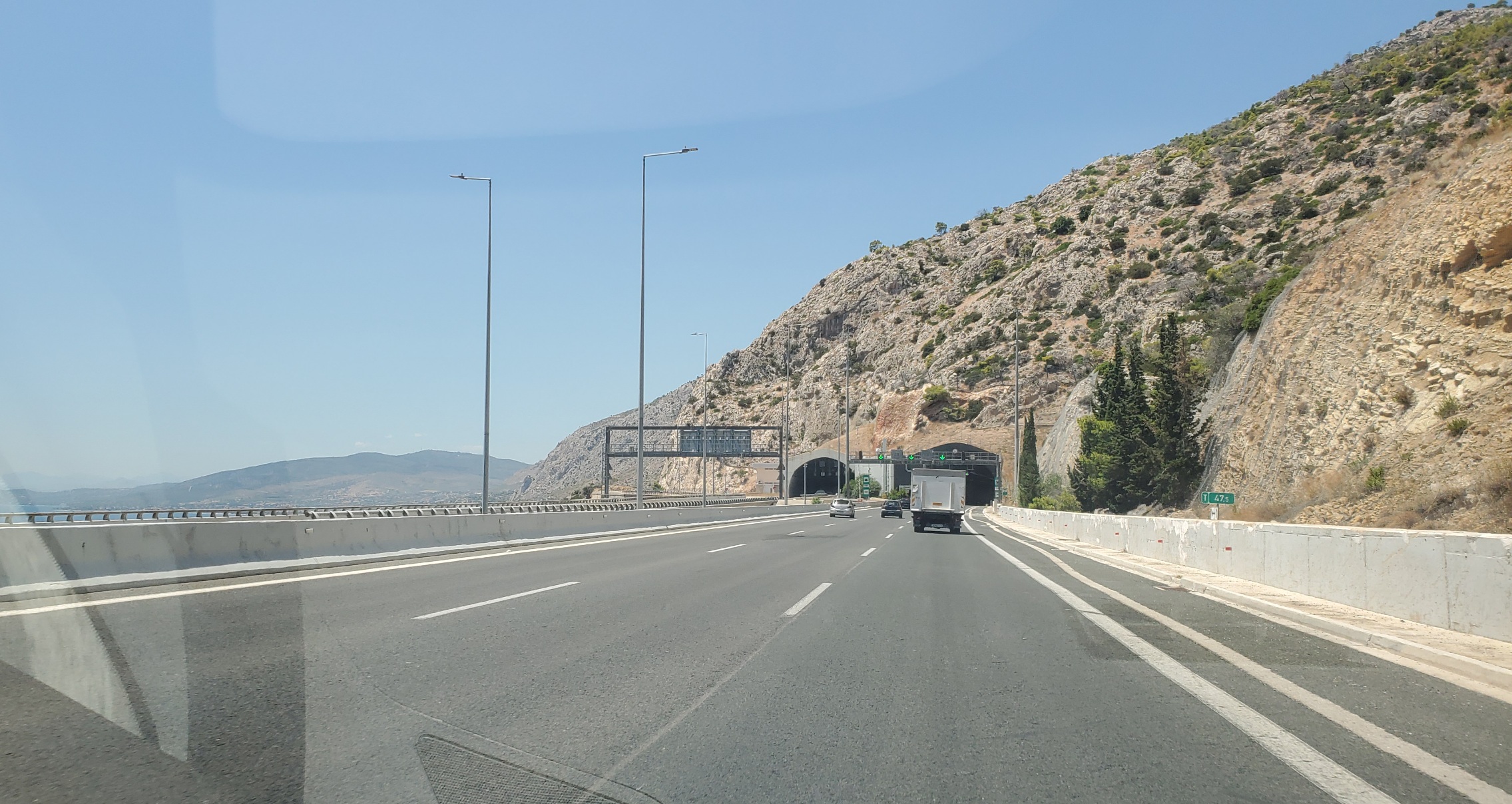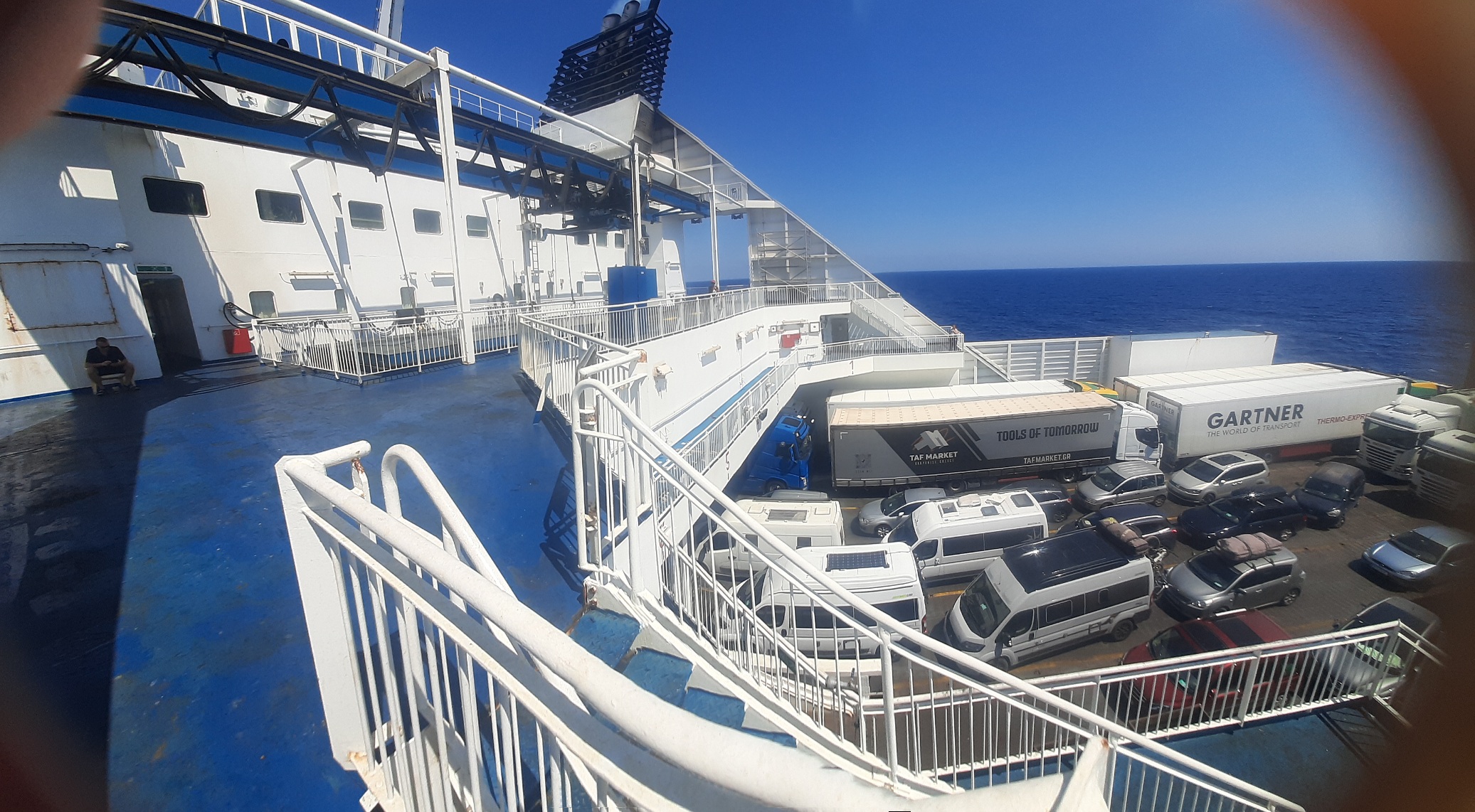 01.06.25 12.35 Sind bei strahlender Sonne und ohne Stress auf griechischem Boden, Hecklappe hoch wir fahren. FB Claudia ist wieder fast so leer wie voriges Jahr. Die Fahrt vom 3.und 4.Juni wird bestreikt. O oh-iiii, ooh-iiii, Baby