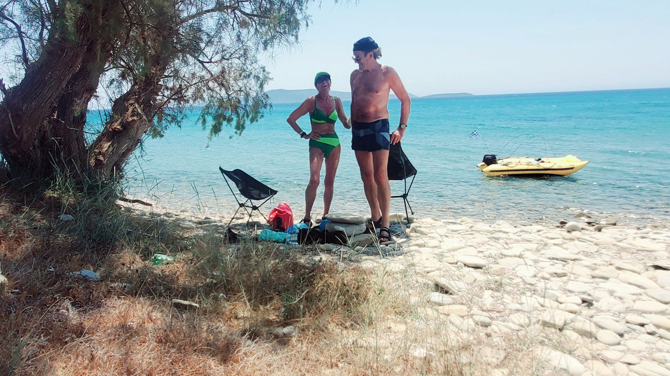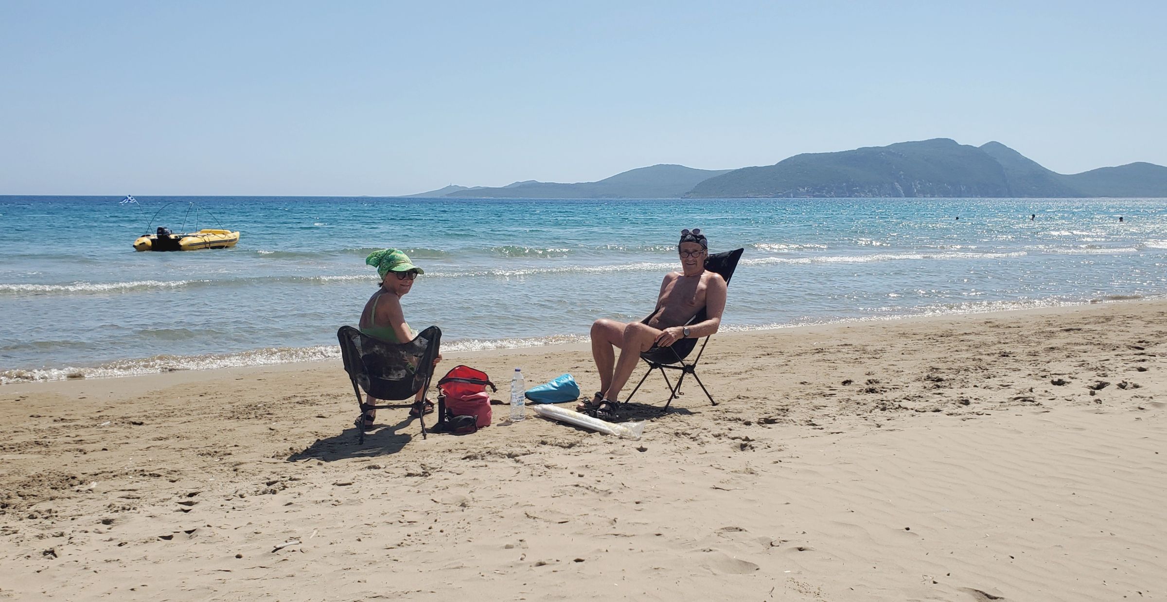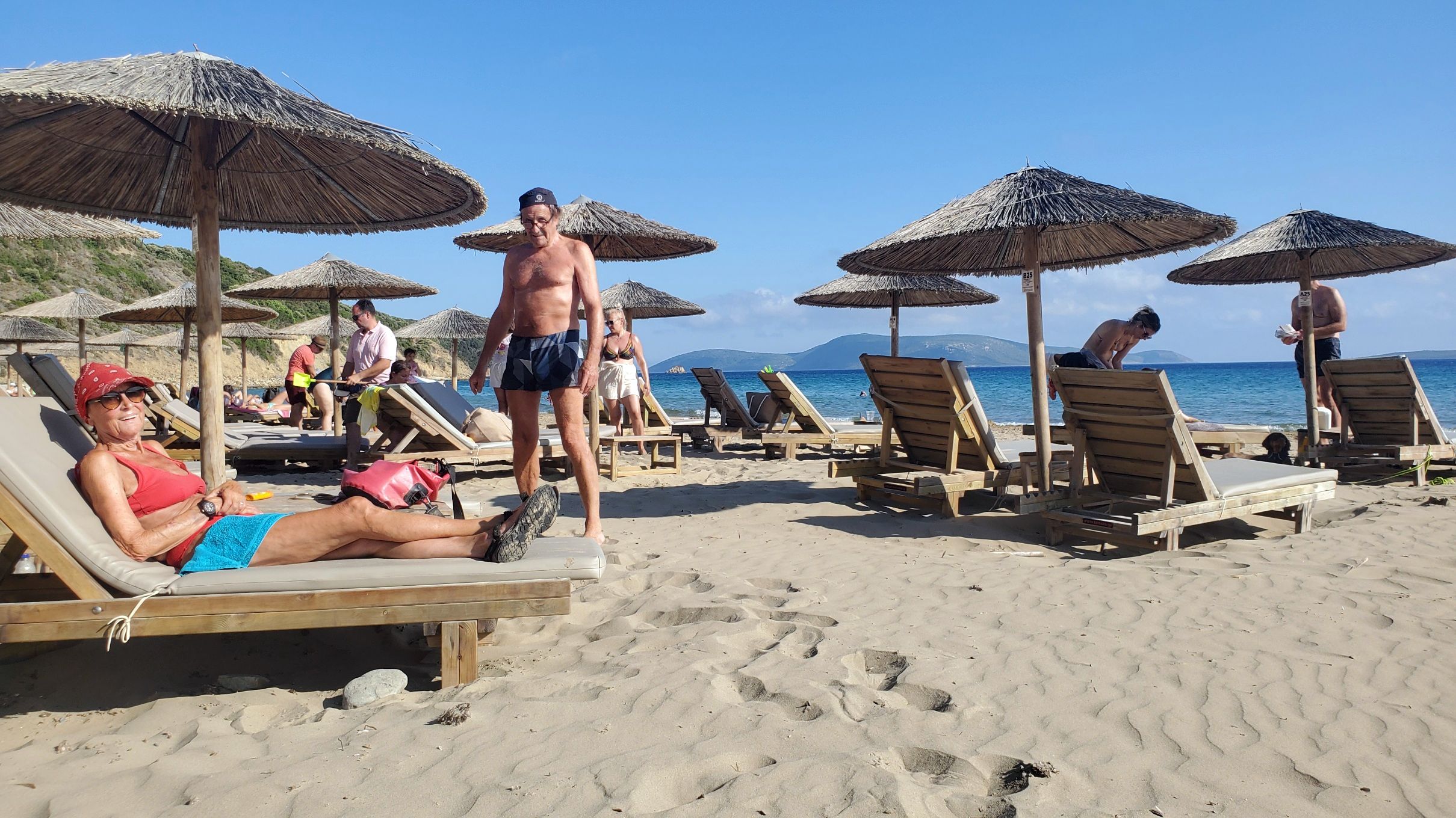 10.06.25 12.45 Duempeln einsam vor Porto Galini. In den großen Hotels herrscht noch angespannte Ebbe. Voriges Jahr lernten wir hier Schweden Touristen kennen.