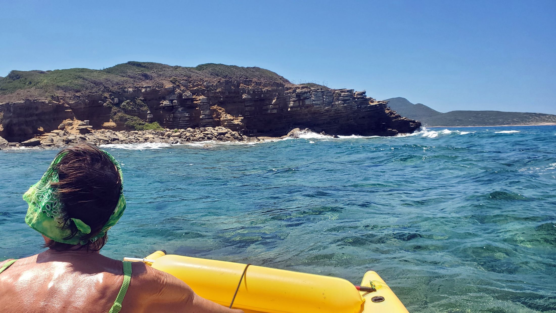 31.07.25 10.23 Der "Maestro Wind" kommt aus suedwest und wir haben max 30°C. Einsame Steinstrandstelle 5km vor und hinter uns ist kein Mensch.