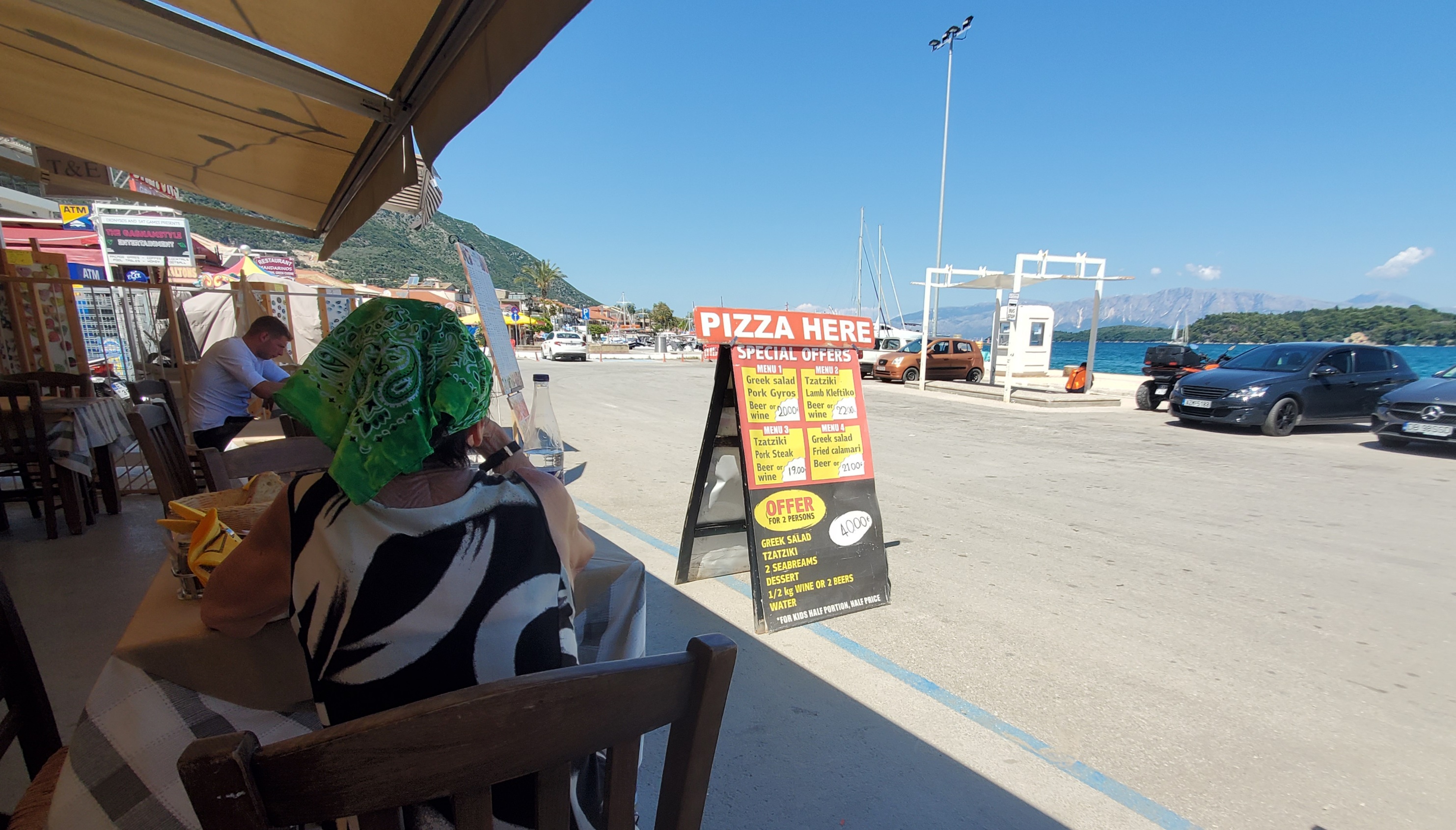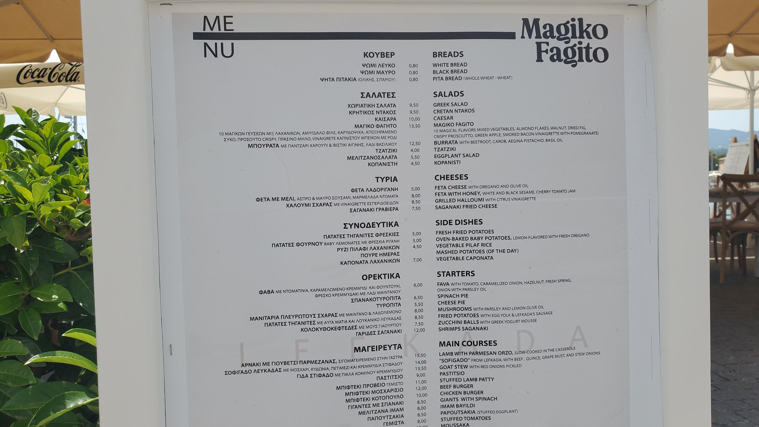 10.06.25 Menue in Lefkada.jpg Geodaten BG:38"49'55.9'' LG:20"42' 32.23