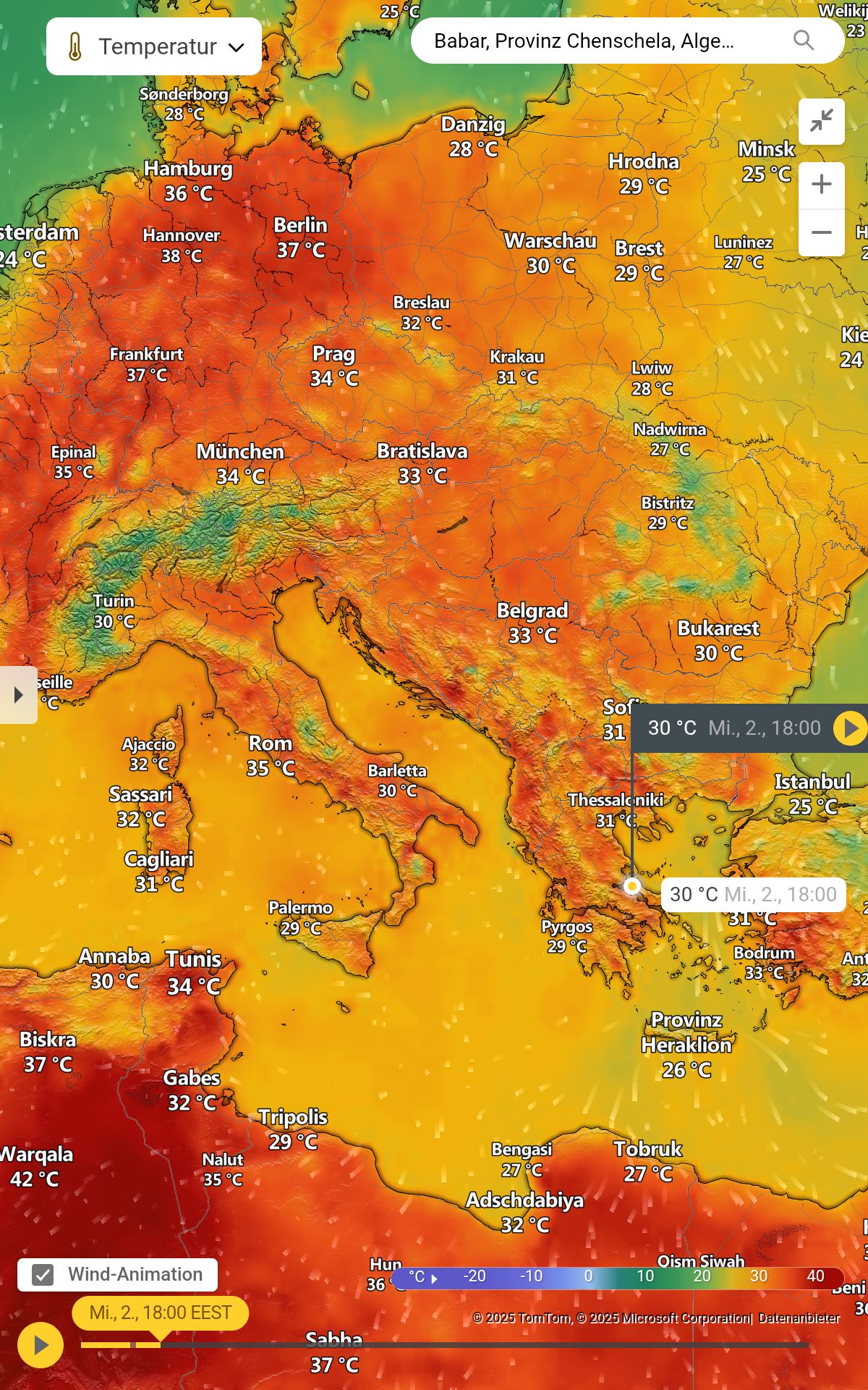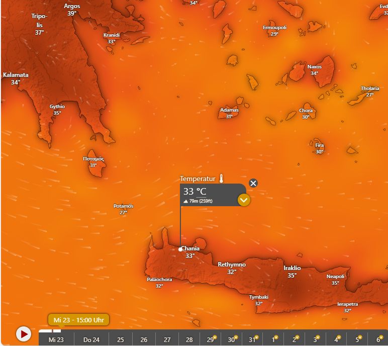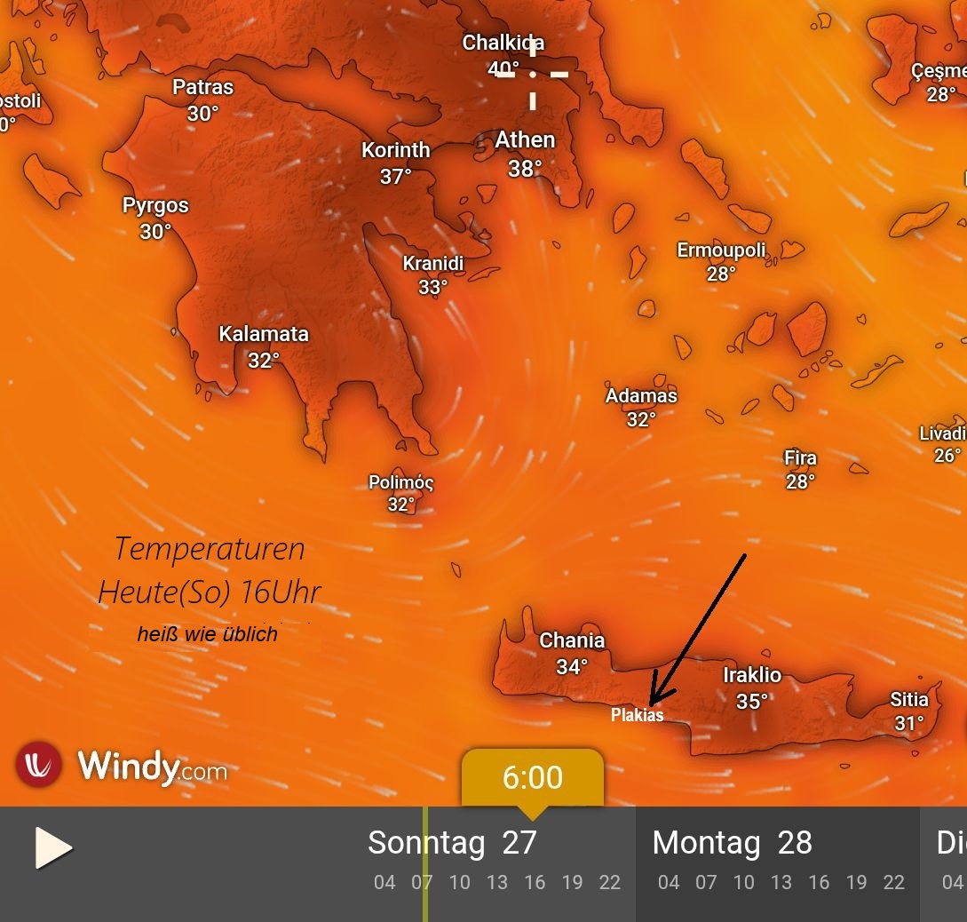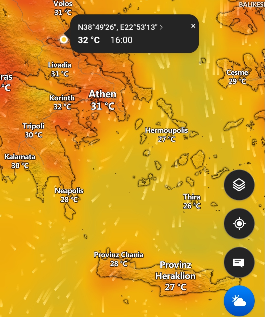 19.06.25 13.17 Moderate Gewitterwarnung und kein Wind bzw. Meltemi bei 34°C. Der Meltemi schwaechelt und saugt keine kalten Luftmassen vom Norden um sie weiter nach nach Afrika zu schaufeln.