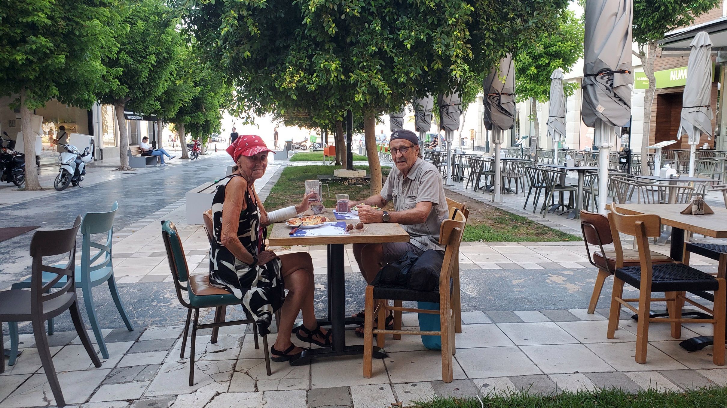 08.08.25 20.07 Ierapetra wollten wir unsere Papageien Ricardo+Mitchock besuchen , aber die dürften bei den Windböen nicht vorm Cafe Herumturnen.
