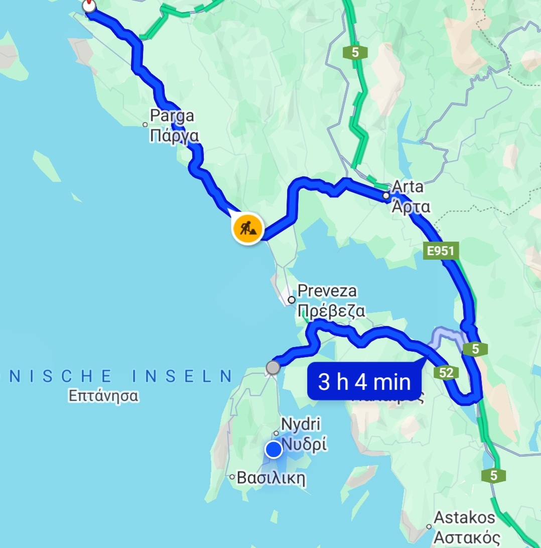 02.06.25 21.55 GoogleMaps schickte uns über 100km auf die alten Landstraßen nach Lefkada zur letzten Ecke von Odysseus Verstecken. Weil der Unterseetunnel von Preveza - Aktio gesperrt ist. Wir beziehen 21Uhr unser Apartment und sind die einzigen Gäste. Schluessel von Númmer 6 steckte. Preise nochmal 30% teurer.
