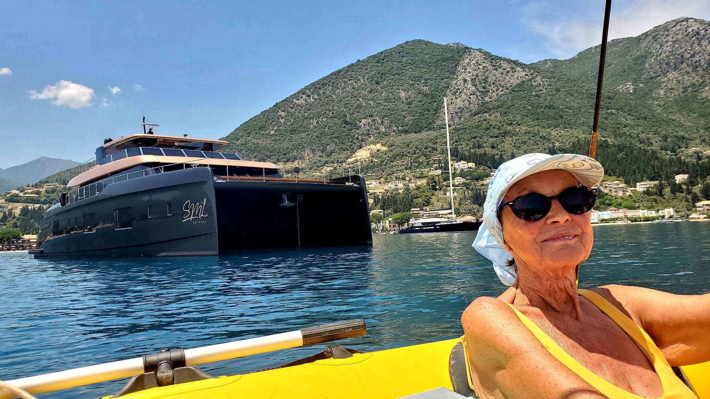 05.06.25 18.40 Vor unserer Nidri Haustuer liegt heute die Yacht Amoa des kuwaitische Milliardär Mohammed Alshaya, Vorstandsvorsitzender der MH Alshaya Company. Mit visionärem Ansatz und dem Streben nach Exzellenz hat Alshaya das Familienunternehmen in einen multinationalen Franchise-Anbieter mit einem beeindruckenden Portfolio von über 80 internationalen Marken verwandelt.